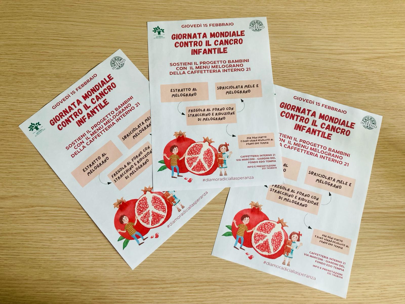 Torna per il secondo anno consecutivo, alla caffetteria Interno 21 di Biella, il menu al melograno e come l’anno scorso le ricette con il frutto simbolo della giornata mondiale contro il cancro infantile serviranno per raccogliere donazioni a favore del Progetto Bambini del Fondo Edo Tempia. Accadrà giovedì 15 febbraio, in corrispondenza con la ricorrenza nata per informare sui progetti che aiutano i progressi della medicina e per accendere una luce sui più fragili tra coloro che vengono colpiti da un tumore.